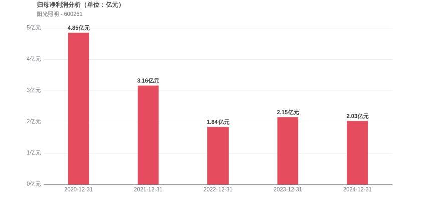 利润角度分析,2020年阳光照明实现归母净利润4.85亿元,2024年2.03亿元。公司盈利能力在近年来出现明显波动,2024年归母净利润较2020年下降58.14%。