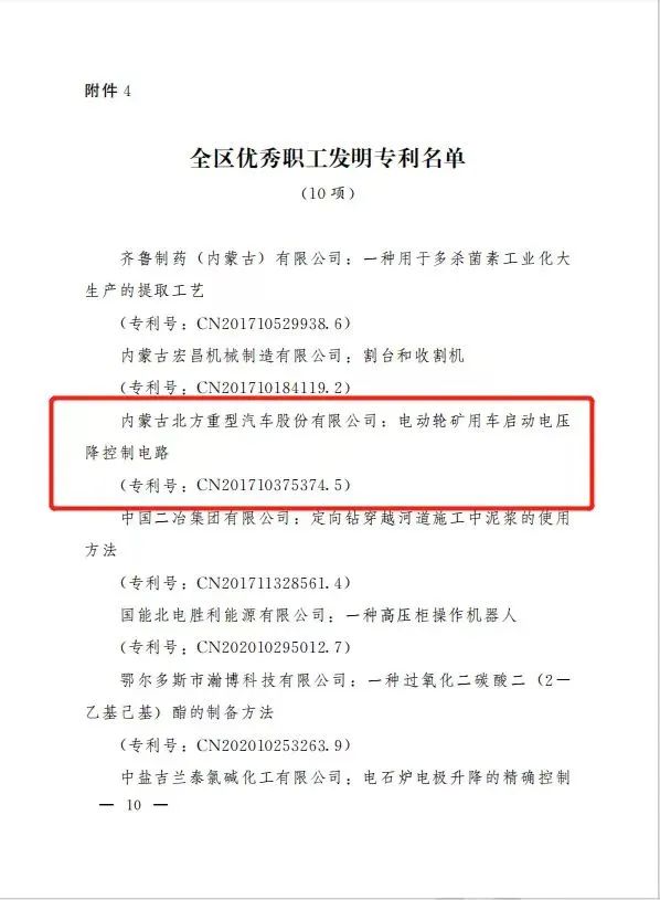 12月23日,内蒙古自治区总工会举行内蒙古自治区职工创新系列活动颁奖仪式,集中表彰命名一批“自治区职工创新工作室联盟”和“自治区职工创新工作室”,首次表彰命名“全区十大职工创新团队”和“全区优秀职工发明专利”。其中命名内蒙古北方重型汽车股份有限公司(以下简称:北方股份公司)“电动轮矿用车启动电压降控制电路”专利为“全区优秀职工发明专利”。