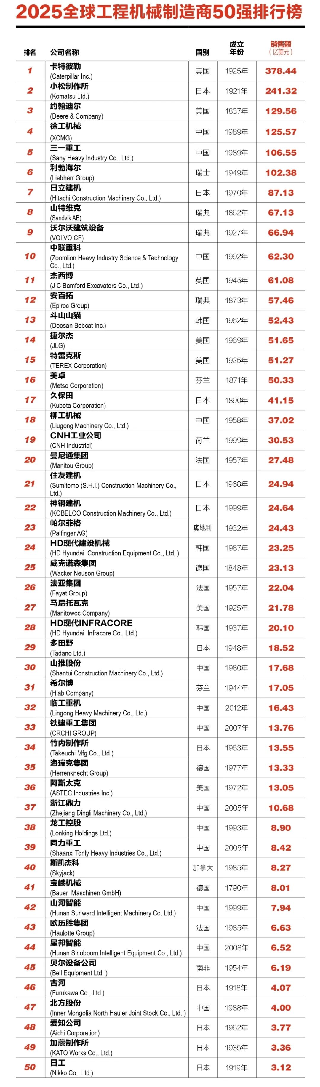 在全球工程机械行业承压前行的2025年,北方股份再次以实力证明其全球地位——连续第十三年荣登“全球工程机械制造商50强”榜单,排名较去年上升2位。在行业整体销售额下滑8.02%、利润空间持续收窄的背景下,这一成就尤为难得。它不仅彰显了北方股份始终坚持的“高端化、智能化、绿色化、国际化”发展战略的正确性,也充分体现了公司强大的发展韧性与增长潜力。