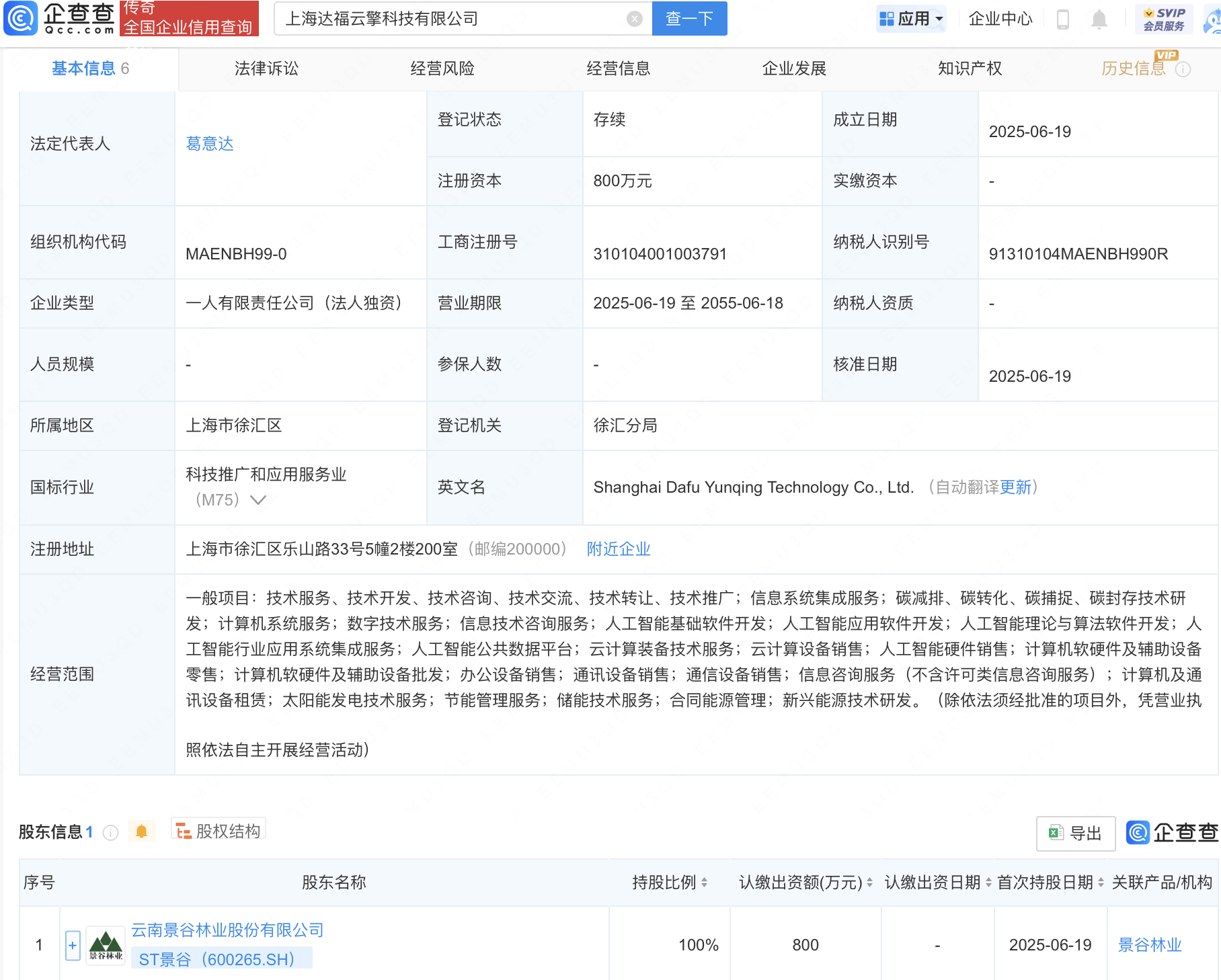 近日,上海达福云擎科技有限公司成立,注册资本800万元,经营范围包含:人工智能基础软件开发;人工智能应用软件开发;人工智能理论与算法软件开发;人工智能行业应用系统集成服务等。股权穿透显示,该公司由ST景谷(600265)全资持股。