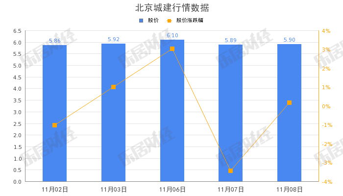截至11月08日,北京城建(600266.SH)股价收盘报5.89元,涨0.17%,总市值133.14亿元。