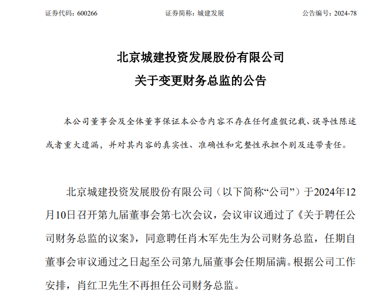 12月10日,城建发展(600266.SH)发布公告,聘任肖木军为公司财务总监。