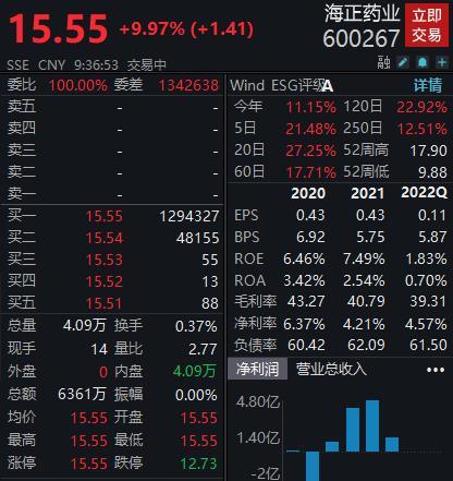 5月20日,受利好消息刺激,海正药业开盘涨停,报15.55元。