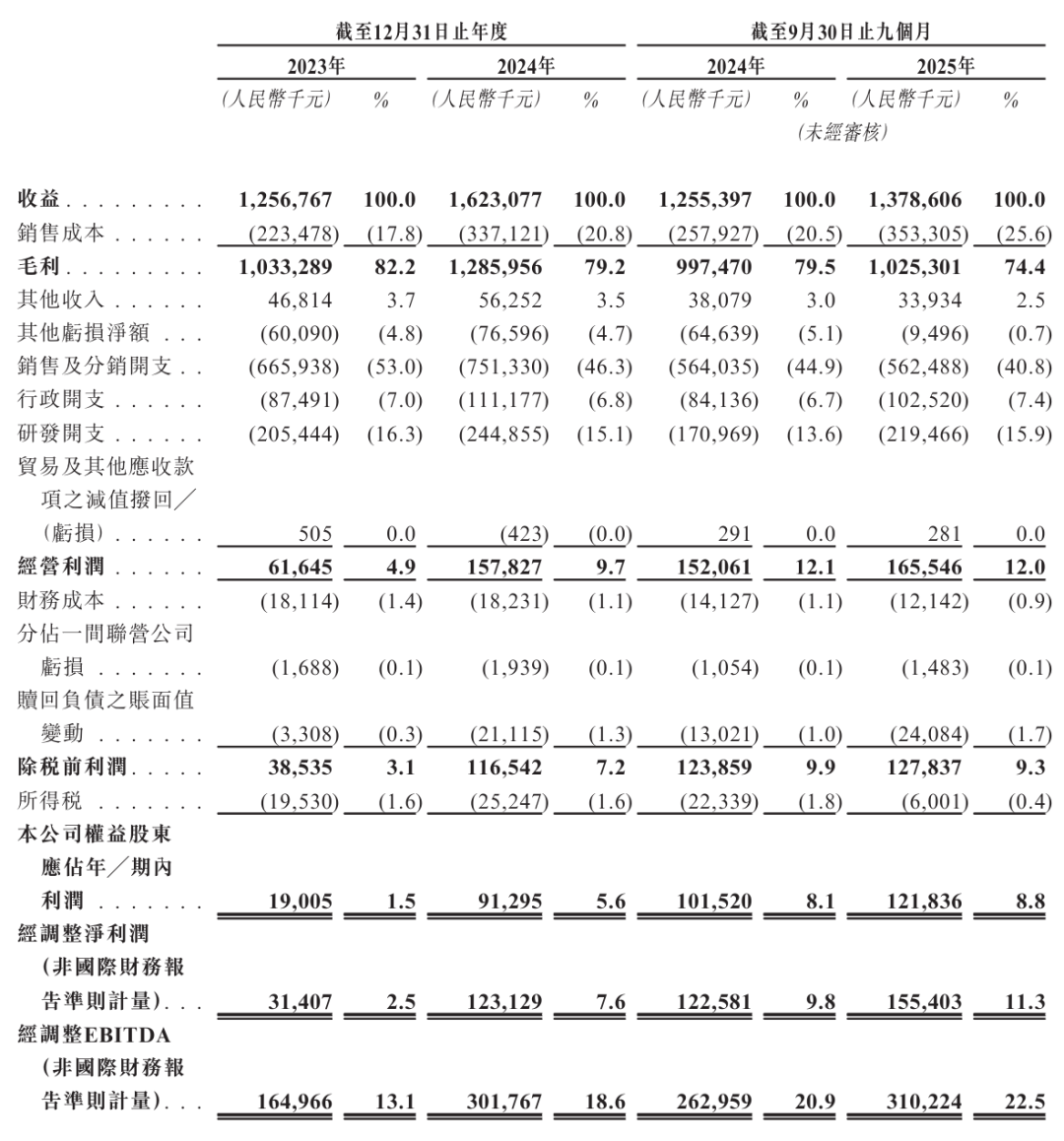 博锐生物2025年前9个月营收为13.79亿元,毛利为10.25亿元,经营利润为1.66亿,净利为1.22亿,经调整EBITDA为3.1亿元。