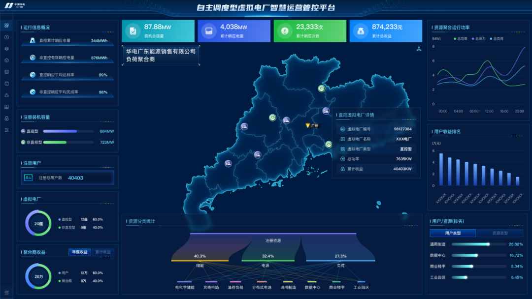 项目依托中国华电集团首批“揭榜挂帅”制项目,基于“自主调控”与“智慧运营”协同的设计理念,研制了支撑电网灵活调度的虚拟电厂智慧运营管控平台及边缘采集控制终端,通过资源可调潜力分析、动态聚合、协调控制、自主响应、投标决策等关键技术,实现资源快速精准响应和虚拟电厂自主参与电网调控或电力辅助服务市场。项目在广东、浙江、重庆、河北、山东等地区试点和应用,包括省地两级自主调度应用场景、边缘侧源网荷储协同优化控制场景、接入调度实时控制场景、参与电力需求响应场景、纯电重卡集群响应场景,为虚拟电厂平台建设和推广提供了实践经验和工程样板,成效显著。