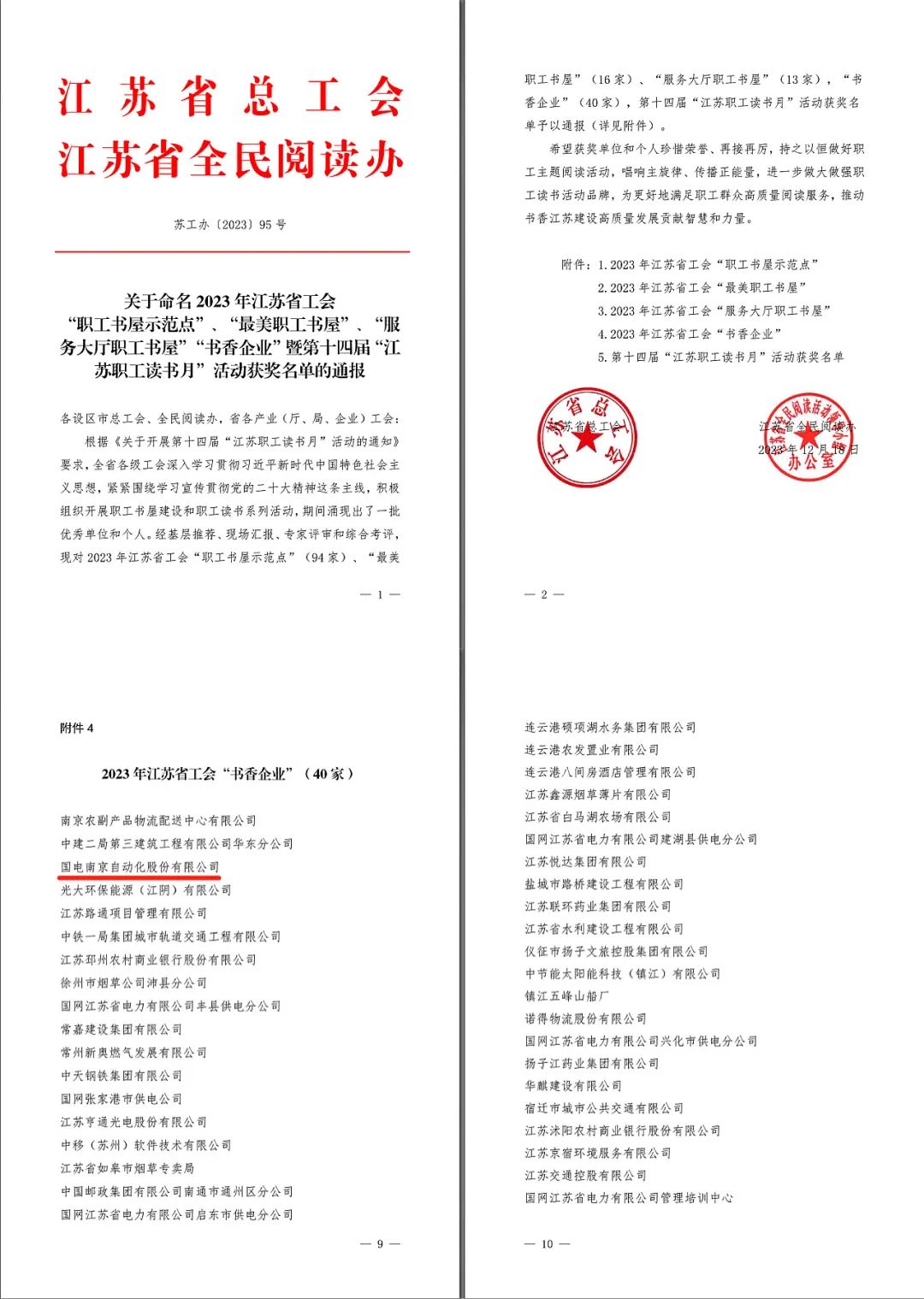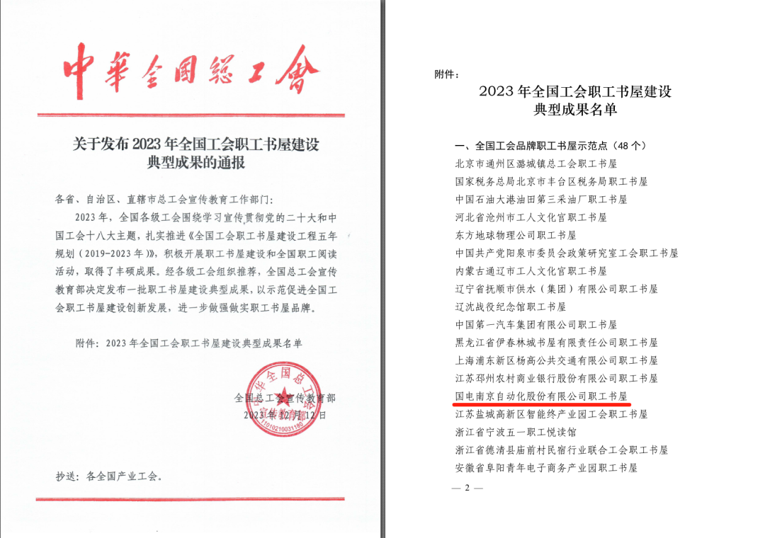 近日,中华全国总工会发布《关于发布2023年全国工会职工书屋建设典型成果的通报》,江苏省总工会、江苏省全民阅读办发布《关于命名2023年江苏省工会“职工书屋示范点”、“最美职工书屋”、“服务大厅职工书屋”暨第十四届“江苏职工读书月”活动获奖名单的通报》,国电南自职工书屋荣获全国工会品牌职工书屋示范点称号,国电南自荣获江苏省工会“书香企业”称号。