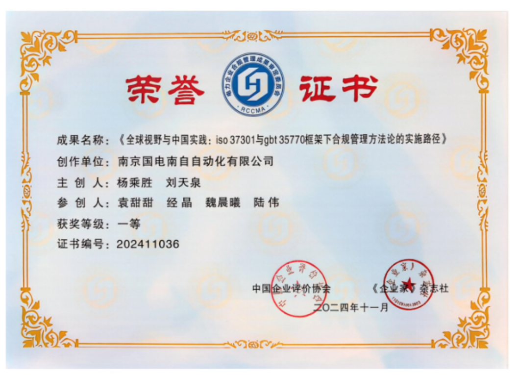 公司以建设“治理完善、经营合规、管理规范”的法治央企为目标,南自自动化实施“四化”合规管理策略:组织架构明确化、制度保障具体化、体系构建融合化、运行实施规范化。公司全面梳理合规义务,识别764项外部和254项内部合规义务,涵盖法规、监管及内部规章。整合多管理体系要求,形成要素融合清单,简化文件管理。明确风险评估程序,梳理870条流程,设立多个合规专项,建立风险清单,试运行中识别13项潜在违规风险。今年,南自自动化申报的《全球视野与中国实践:ISO 37301与GBT 35770框架下合规管理方法论的实施路径》课题荣获一等奖。