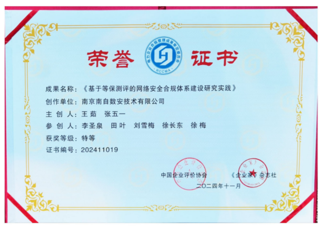 国电南自深入贯彻国家“网络强国”战略关于网络安全的工作要求,依托南自数安打造网络安全检测认证的专业平台,持续提升检测检验、攻防对抗、技术创新三种能力,提出基于等保测评的网络安全合规体系建设路径,以筑牢企业风险防控屏障为目标,支撑企业效益持续提升,护航企业高质量发展。在今年大会上,南自数安申报的《基于等保测评的网络安全合规体系建设研究实践》课题荣获特等奖。