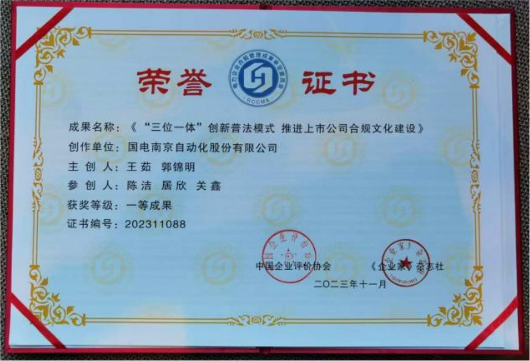 在法治央企的建设过程中,国电南自坚持以法治建设为核心,认真贯彻落实法治央企建设、八五”普法规划要求,在工作中探索出“三位一体”的创新普法模式,采用“小智、小慧”动漫普法、司法“零距离”等方式,提高普法的穿透力、传播力和亲和力,把企业法治建设工作落到实处,持续推进上市公司合规文化建设,为企业高质量发展保驾护航。在2023年大会上,国电南自《“三位一体”创新普法模式推进上市公司合规文化建设》课题荣获一等奖。