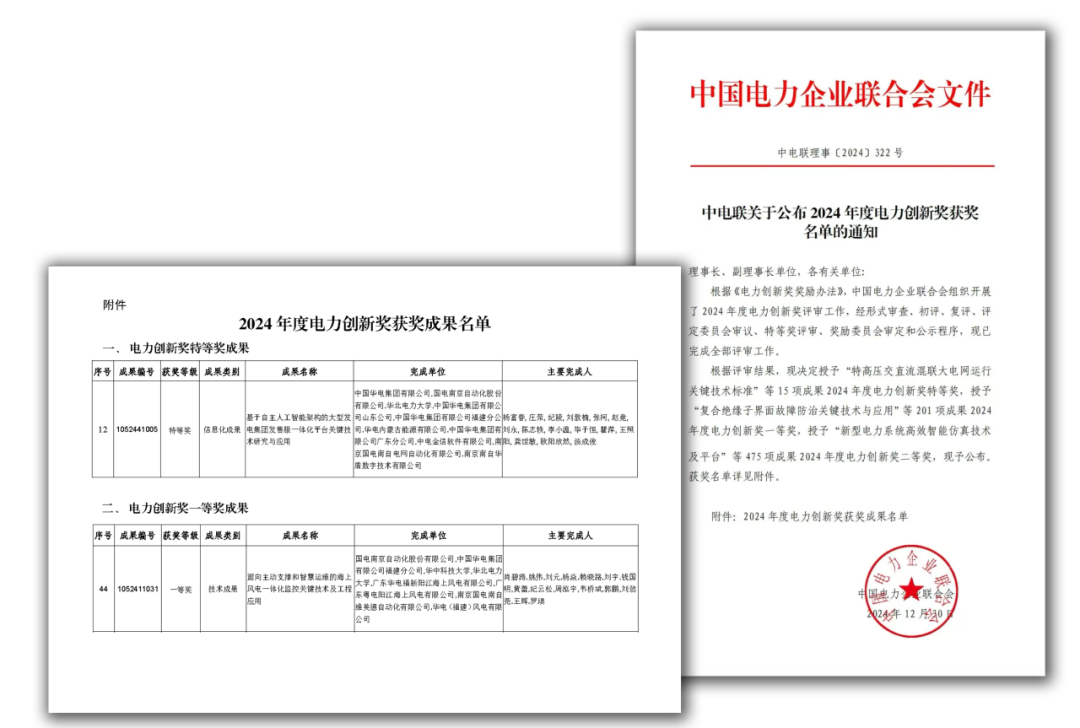 近日,中国电力企业联合会公布2024年度电力创新奖获奖名单,国电南自荣获特等奖1项,一等奖1项。其中,由中国华电牵头,国电南自作为主要支撑单位完成的《基于自主人工智能架构的大型发电集团发售服一体化平台关键技术研究与应用》项目获得特等奖,位列信息化类获特等奖第一名;由国电南自牵头完成的《面向主动支撑和智慧运维的海上风电一体化监控关键技术及工程应用》项目获得技术成果类一等奖。