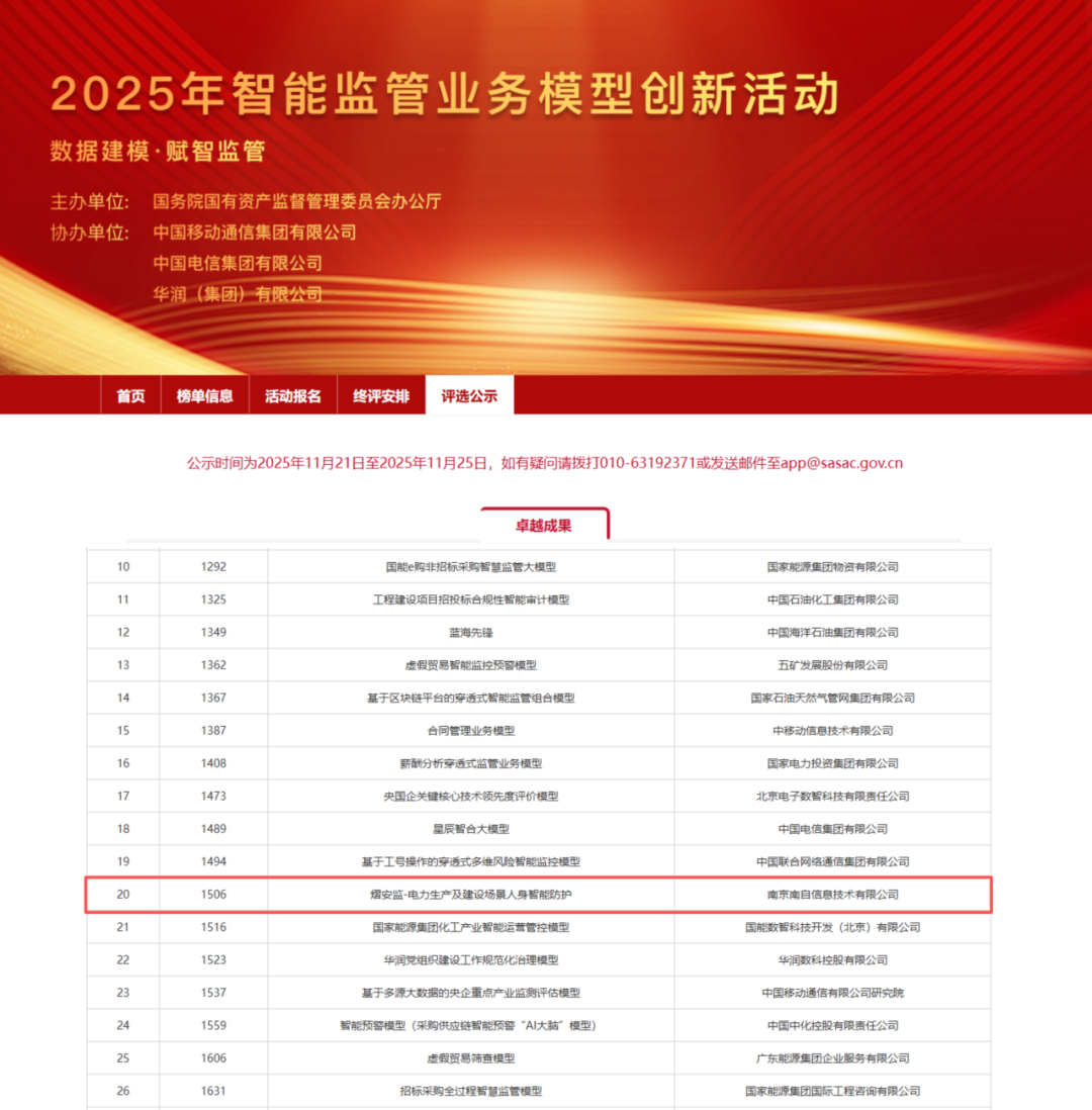 近日,国务院国资委办公厅主办的“智能监管业务模型创新活动”评选结果揭晓, 国电南自 所属企业南自信息《熠安监-电力生产及建设场景人身智能防护》荣获“卓越成果奖”。