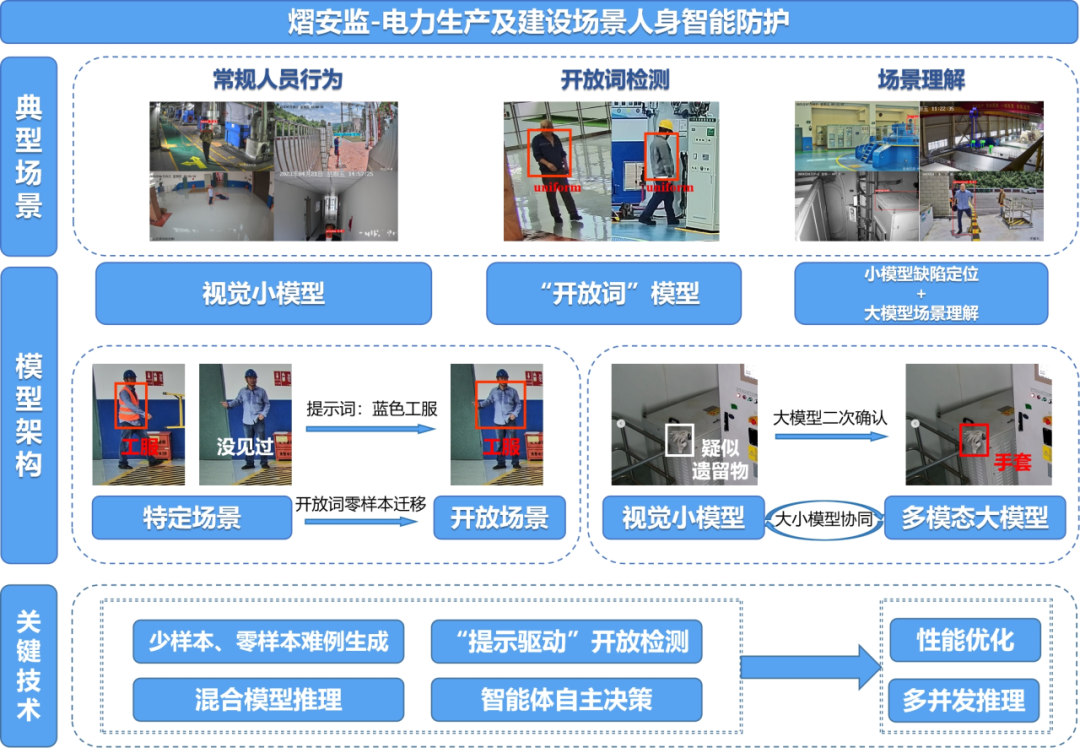 《熠安监-电力生产及建设场景人身智能防护》针对电力生产、基建场景下安全管理需求,基于视觉小模型、开放词汇检测模型以及多模态大模型的混合架构构建。对于开放词检测场景,通过提示微调,调整语言分支和视觉检测头权重,实现特定场景模型向新场景快速迁移;基于小模型定位加大模型场景理解的大小模型协同模式,提升异常、缺陷识别准确性。模型训练数据依托中国华电发电智能巡检与安全管控数据集,覆盖“风、光、水、火”不同发电形式;对于少样本、零样本场景,采用大模型辅助难例生成,解决数据时间-空间变化问题。模型将通过挖掘安全场景,引领数据集构建并驱动模型迭代,助力安全管理,以实现社会责任担当。