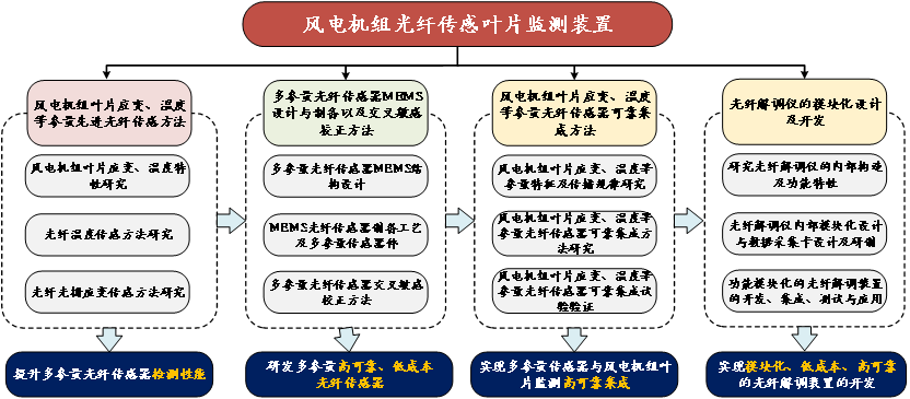 针对光纤传感设备可靠性不高、灵敏度不足的难题,项目设计了基于杠杆增敏结构的光纤传感微结构,同时提出结合双重温度补偿的参考光栅,并引入多项式补偿算法,以建立多项式补偿模型的弱光纤光栅阵列传感系统,实现了风机叶片应变温度信号的精准实时感知。