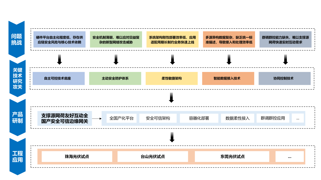 以支撑新型电力系统中源网荷友好互动为目标,项目研制了全国产安全可信边缘网关装置。重点开展全国产化软硬件平台构建技术、基于硬件可信根的主动安全体系、容器化弹性编排技术及双灵敏度群调群控技术等研究。项目成果已应用于分布式光伏等项目。