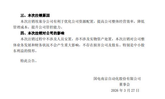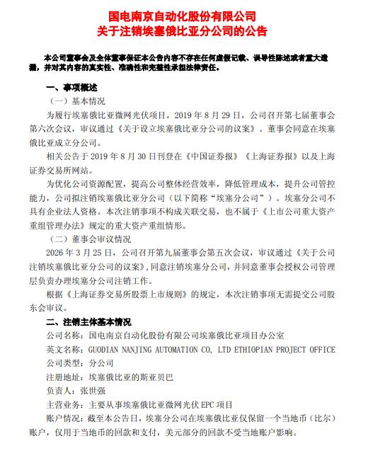 3月27日,国电南自发布关于注销埃塞俄比亚分公司的公告。