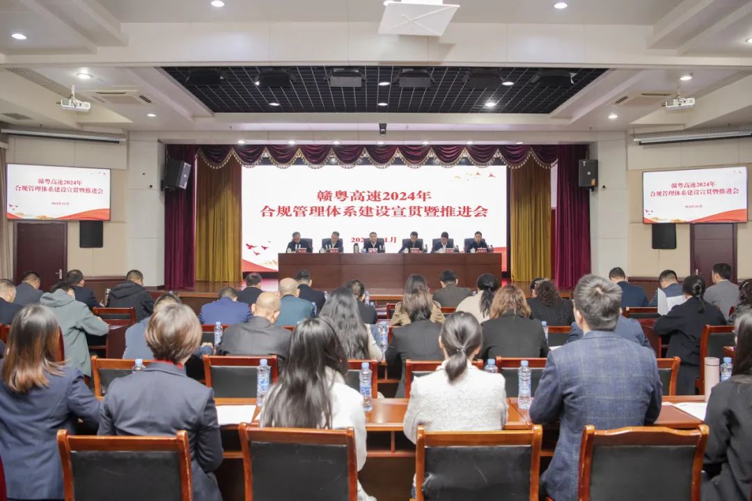 11月20日,赣粤高速召开2024年合规管理体系建设宣贯暨推进会。赣粤高速党委书记、董事长韩峰出席并讲话,党委委员、副总经理余小晴同志主持会议,公司在家领导班子成员出席。司属各单位主要负责同志、分管同志、职能部门负责同志及相关人员,本部各部门负责同志共计60余人参加会议。