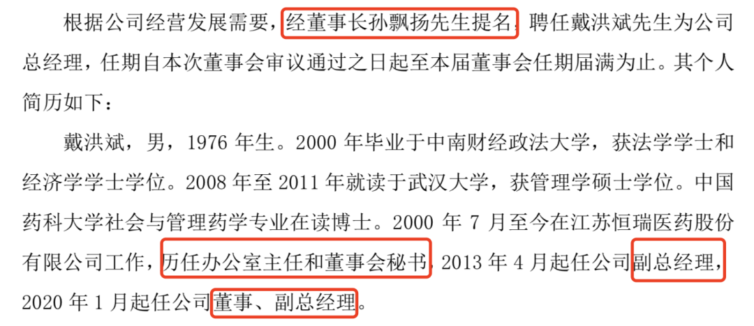 公开资料显示,戴洪斌大学毕业后即加入恒瑞医药,至今已有22年。他2003年任公司董事会秘书、2013年任公司副总经理,2020年起任公司董事、副总经理,并成为公司战略委员会成员,是公司妥妥的“老将”。