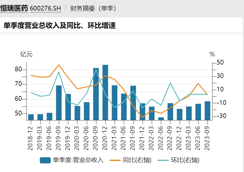 wind数据显示,自2021年第一季度起,恒瑞医药多次出现单季度营收环比下跌。今年第一季度和第二季度环比增幅在3%以上,此次则是恒瑞医药连续第三个季度实现营收环比增长。