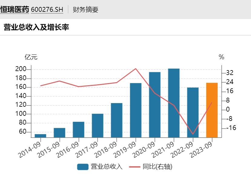 前三季度整体来看,恒瑞医药实现营业收入170.14亿元,同比增6.70%;归母净利润34.74亿元,同比增9.47%;归母扣非净利润33.6亿元,同比增长10.13%。恒瑞医药去年三季度营收净利同比下降,此次营收净利同比数据回归正向增长。