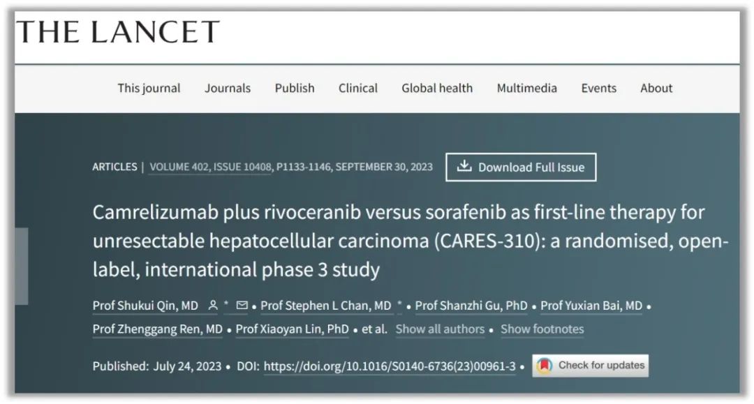 2023年,公司在美国、欧洲、亚洲、大洋洲与国内等都建有研发中心,形成功能互补、各有特征的全球研发体系(图4)。同年获批 14 款自研 1 类创新药、4 款 2 类新药和 2 款引进创新药。其中注射用卡瑞利珠单抗(艾瑞卡)联合甲磺酸阿帕替尼片(艾坦)(“双艾”组合)的生物制品许可申请获美国食药监局正式受理,拟用于不可切除或转移性肝细胞癌患者的一线治疗,发表于《柳叶刀》杂志(影响因子168.9)(图5)。