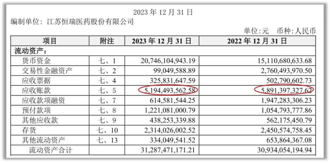 恒瑞医药的应收账款在资产中占有较大比例,2023年末公司应收账款余额 52.76 亿元,应收账款净值 51.94亿元,应收账款净值占合并资产总额11.86%,占流动资产16.8%,公司对应收账款计提的坏账准备为0.82亿元。应收账款的可收回性对于财务报表具有重要性,公司对应收账款的管理和坏账准备计提采取了较为谨慎的策略(图6)。