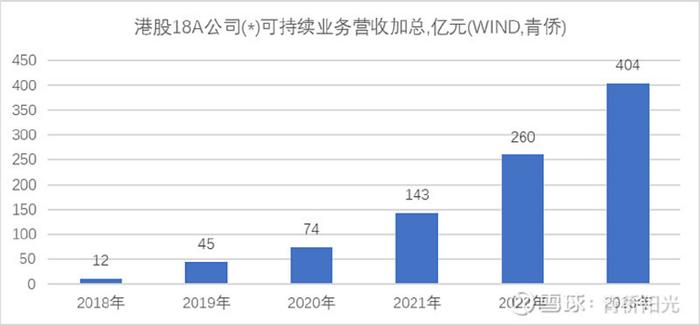 说完头部大药企,我们再来看一下国内62家相关的18A创新药企业近些年营收情况,从2018年的12亿元、2019年的45亿元、2020年的74亿元、2021年的143亿元增长到2022年的260亿元,到了2023年进一步攀升到404亿元,继续保持强劲增长,根据相关机构预测,不出意外,这些企业的总营收将在2026年突破千亿。