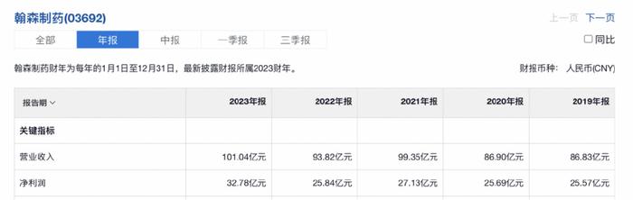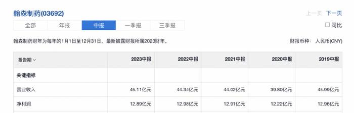 果然,到2023年H2,翰森制药的业绩就突然加速了,以此带动公司全年实现营业收入101.04亿元,同比+7.69%;净利润约32.78亿元,较去年同期增长约26.9%。我们再看下面这张图,到了2023年报的时候,翰森就明显终结了过往几年“原地踏步”的情况。