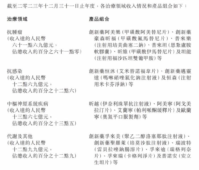 2023年,翰森的营收首次突破百亿大关。其中抗肿瘤是绝对的大头,收入61.69亿元,占总收入比重61.0%;抗感染领域收入12.69亿元,占总收入比重12.6%;中枢神经系统疾病领域收入13.67亿元,占总收入比重13.5%;代谢及其他领域收入12.99亿元,占总收入比重12.9%。各个治疗领域均有创新药产品上市销售。