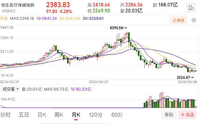 以上种种数据都表明,我国的生物医药产业已经焕然一新,但当下的资本市场却并没有将此反映出来,尤其是香港市场,可以说当下处于近十年的最低点,下图为恒生医疗保健指数的走势。