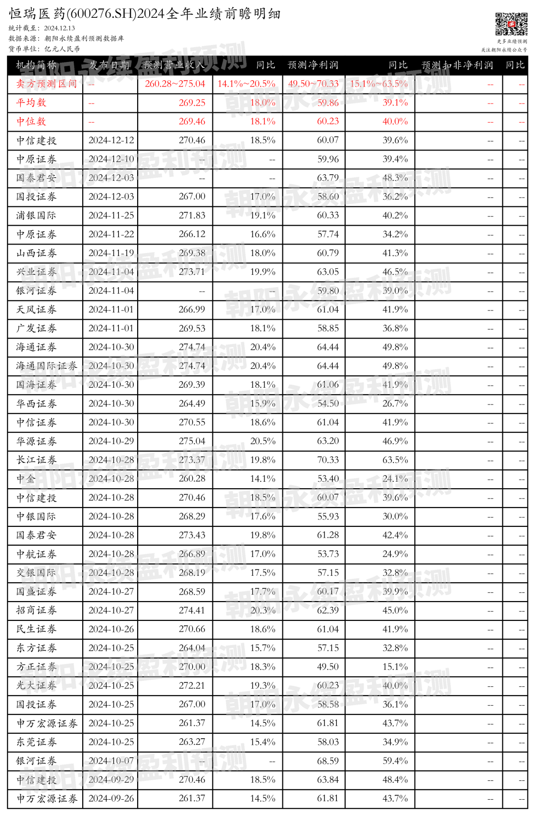 方正证券认为:恒瑞医药2024年第三季度报告显示,公司实现营业收入201.89亿元,同比增长18.67%,归母净利润46.20亿元,同比增长32.98%,扣非净利润46.16亿元,同比增长37.38%。第三季度单季度营业收入65.89亿元,同比增长12.72%,归母净利润11.88亿元,同比增长1.91%,扣非净利润11.26亿元,同比增长0.84%。公司营收稳健增长,持续高强度研发投入,保障未来发展。国内创新药上市进程加速,创新成果不断涌现,公司自身免疫疾病领域首个创新药夫那奇珠单抗注射液在国内获批上市,瑞拉芙普α注射液和注射用瑞康曲妥珠单抗上市许可申请获得国家药监局受理。国际化战略稳步推进,2款首仿产品海外获批上市。