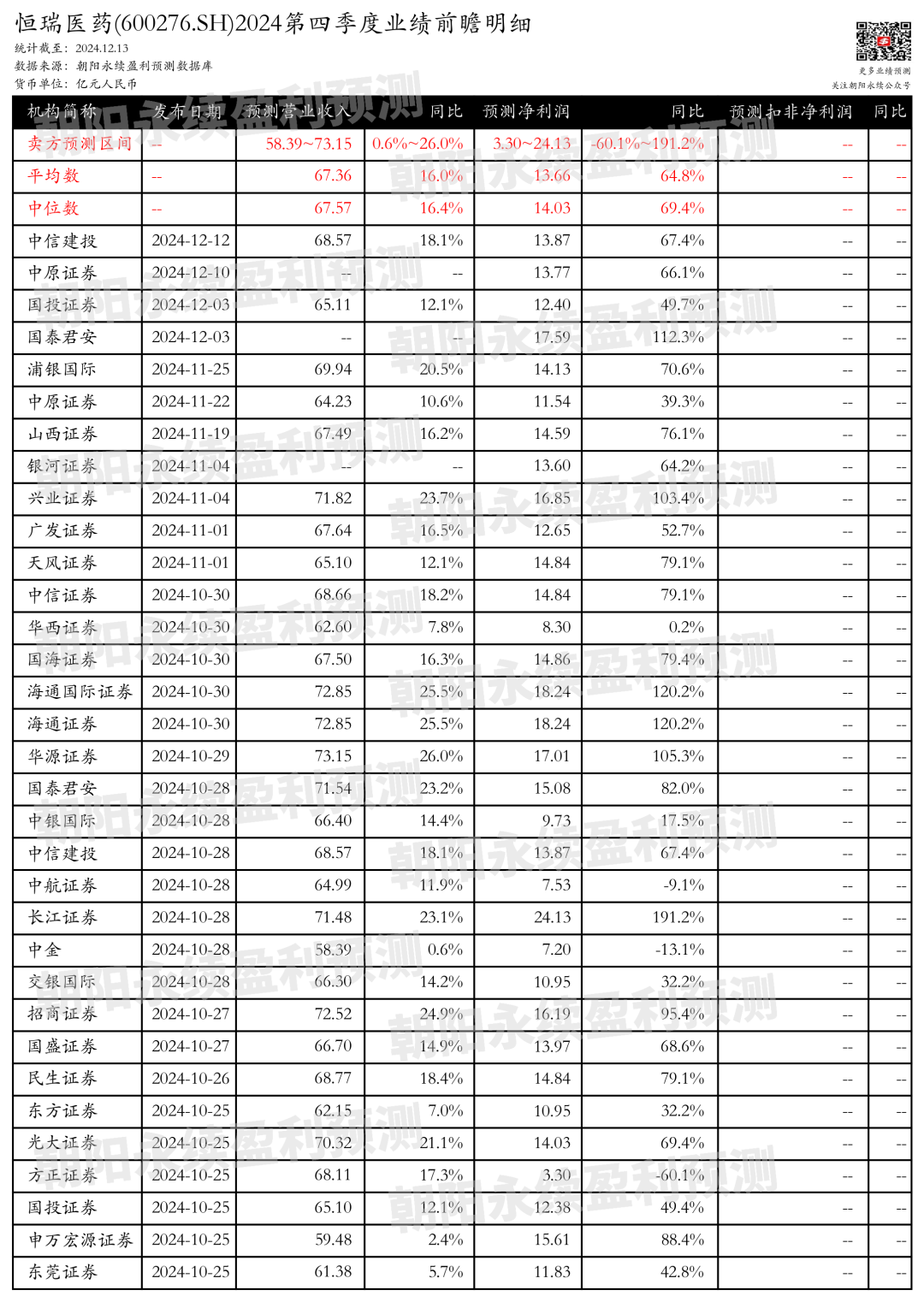 截止2024年12月13日,根据朝阳永续季度业绩前瞻数据: