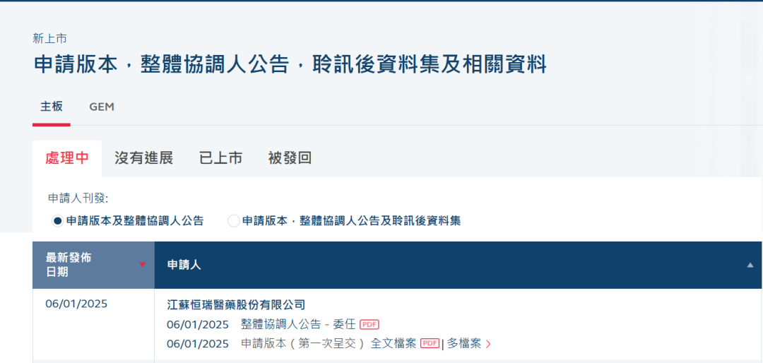 2025年1月6日晚间,港交所官网显示,恒瑞医药正式递交港交所上市申请,摩根士丹利、花旗和华泰国际为联席保荐人。
