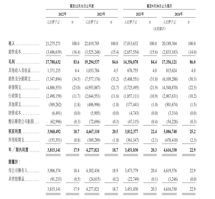 此外,恒瑞医药的净利润率由2022年的17.9%增至2023年的18.7%,并进一步增至截至2024年9月30日止九个月的22.9%。
