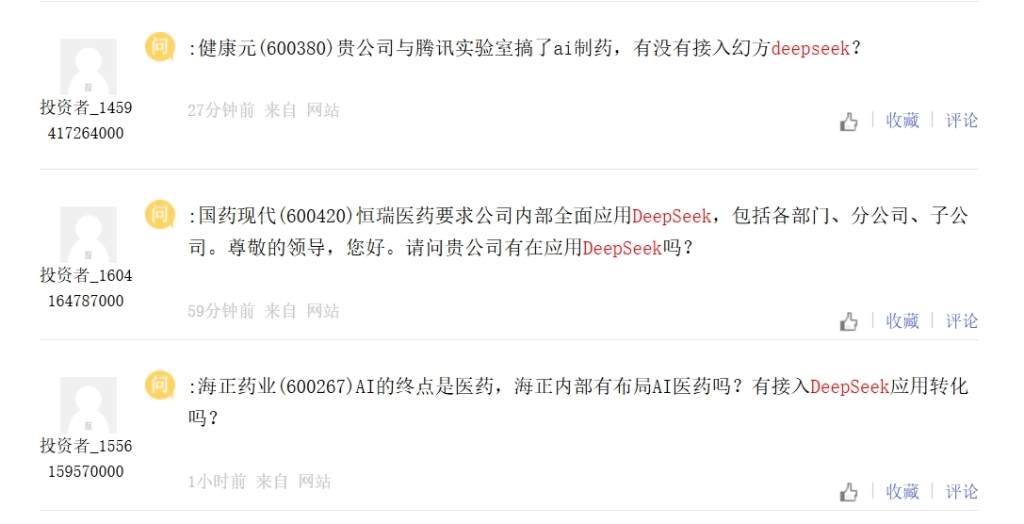 近期,中国企业深度求索(DeepSeek)开发的大模型DeepSeek-R1引发AI业内震动,亚马逊AWS、微软Azure等都宣布接入DeepSeek-R1模型。在DeepSeek大火的背景下,也有医药健康企业也被投资者追问应用情况,但目前并未有公司像恒瑞医药有明确的消息。例如,信邦制药在2月5日回答投资者提问时称,公司将持续关注新技术在医疗领域的发展,并积极探索新技术在公司业务上的运用。