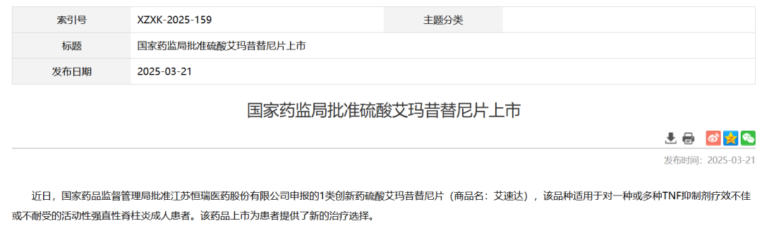 3月21日,NMPA官网显示,恒瑞医药JAK1抑制剂艾玛昔替尼片(SHR0302)的上市申请已获批准,用于非甾体抗炎药(NSAIDs)治疗疗效欠佳或不耐受的活动性强直性脊柱炎成人患者。