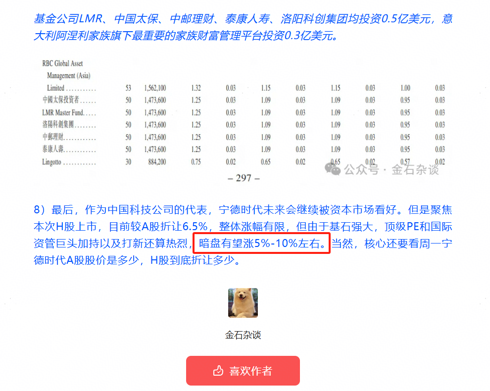 5)恒瑞医药引入7名基石,同样有不少知名机构,知名国际投资机构GIC投资2.68亿美元,国际知名资管公司景顺投资投资0.75亿美元,瑞银投资0.6亿美元,中国顶级PE博裕资本投资0.4亿美元,中国顶级PE高瓴资本投资0.4亿美元,全球资管公司Millennium Capital投资0.3亿美元,知名PE橡树资本投资0.2亿美元。其中,博裕资本、橡树资本、高瓴资本也是宁德时代的基石。
