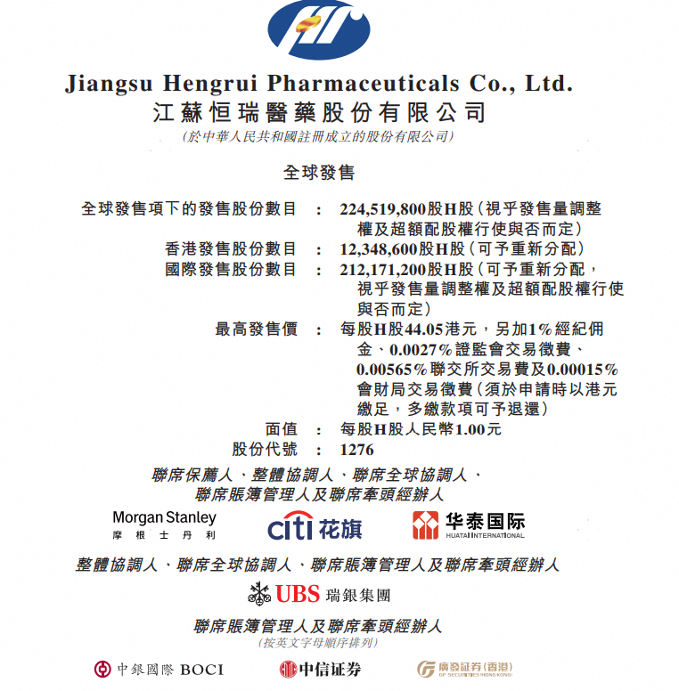 由于时间关系,金石杂谈就简单说几点恒瑞医药的质地,1)本次发售2.2452一股,也就是H股大约100亿港元的市值,盘子小,而且联席保荐人有大摩,护盘能力比较突出。