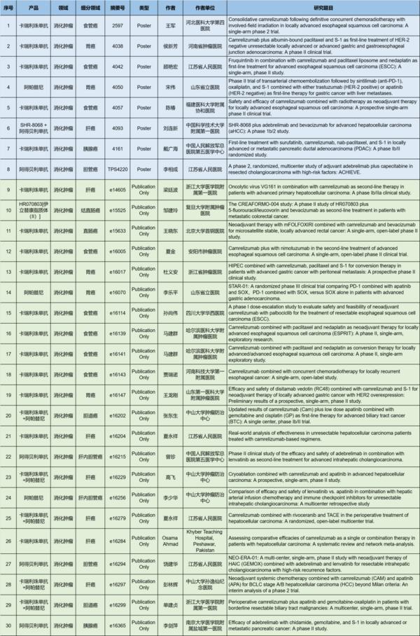 在消化系统肿瘤领域,卡瑞利珠单抗、阿帕替尼、阿得贝利单抗、SHR-8068等药物,共有30项研究入选(包括8项壁报和22项线上发表)。其中卡瑞利珠单抗占据21项,全面展现其显著特点与潜力,再次成为ASCO舞台焦点之一,续写国产PD-1抑制剂新篇章。此外,近年来在肺癌领域取得一系列突破的阿得贝利单抗也在积极探索新的适应症,本次ASCO大会分别有肝癌、胆管癌、胰腺癌等5项相关研究入选。这些新老药物前沿研究的不断出现,有望为消化系统肿瘤患者带来更多获益!