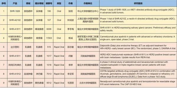 在肺癌、妇科肿瘤、淋巴瘤、膀胱癌、头颈肿瘤、黑色素瘤、肉瘤、鼻咽癌、脊索瘤、唾液腺癌、胸腺癌、硬纤维瘤、涎腺导管癌等其他多个疾病领域,卡瑞利珠单抗、阿帕替尼、阿得贝利单抗、吡咯替尼、达尔西利、氟唑帕利、法米替尼、瑞康曲妥珠单抗(SHR-A1811)、SHR-1501、瑞拉芙普-α(SHR-1701)、SHR-1826、SHR-A1912、SHR-A2102等抗肿瘤创新药相关研究一共入选了4项口头报告、2项快速口头报告、12项壁报展示和4项线上发表,彰显了恒瑞医药强劲的研发实力。此外,昂丹司琼口溶膜在防治化疗导致的恶心呕吐方面展现出了良好的疗效,本次ASCO年会有1项研究线上发表。