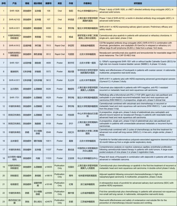 涉及的创新药包括8款已上市创新产品:注射用卡瑞利珠单抗(艾瑞卡?)、甲磺酸阿帕替尼片(艾坦?)、马来酸吡咯替尼片(艾瑞妮?)、羟乙磺酸达尔西利片(艾瑞康?)、阿得贝利单抗注射液(艾瑞利?)、氟唑帕利胶囊(艾瑞颐?)、注射用瑞康曲妥珠单抗(艾维达?,研发代号:SHR-A1811)、苹果酸法米替尼胶囊(艾比特?),以及7款未上市创新产品:抗PD-L1/TGF-βRII双抗瑞拉芙普-α(SHR-1701)、IL-15融合蛋白SHR-1501、双特异性抗体SHR-2017、全人源抗CTLA-4单克隆抗体SHR-8068、抗体偶联药物(ADC)SHR-1826、SHR-A1912、SHR-A2102。2类新药盐酸伊立替康脂质体注射液(II)(越优力?)及国内首仿药昂丹司琼口溶膜(艾其速?)各有1项研究入选。