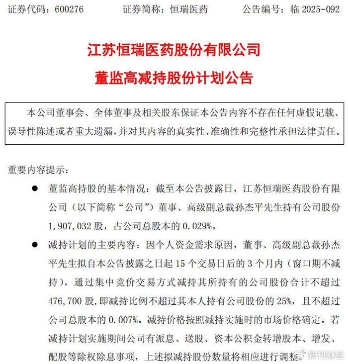2025年6月15日,恒瑞医药(600276.SH;1276.HK)发布公告,董事、高级副总裁孙杰平拟减持不超过47.67万股,占其本人所持公司股份的25%。按照6月13日收盘53.89元/股计算,本次减持金额或超过2500万元。