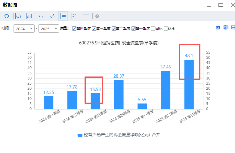 截至九月底,恒瑞经营现金流净额同比增长98.69%,再拉每个季度的现金流看一下,今年第三季度经营现金流净额明显新高,达到了48.1亿元。