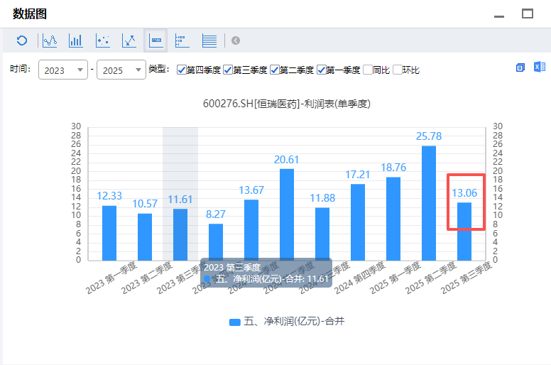 今年第三季度恒瑞医药的净利润只有13.06亿元,大约只有第二季度的二分之一;