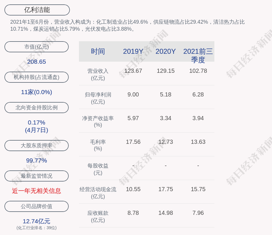 2021年1至6月份,亿利洁能的营业收入构成为:化工制造业占比49.6%,供应链物流占比29.42%,清洁热力占比10.71%,煤炭运销占比5.79%,光伏发电占比3.88%。