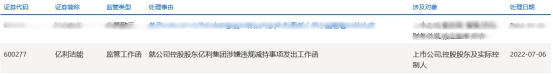上交所网站昨日对亿利洁能(600277.SH)下发监管工作函,处理事由为就公司控股股东亿利集团涉嫌违规减持事项发出工作函,涉及对象为上市公司,控股股东及实际控制人。
