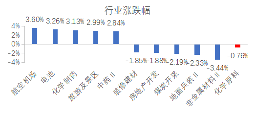 12月8日,化学原料行业下跌0.76%,沪深300下跌0.25%,化学原料行业跑输大盘0.51pct。从全行业看,涨幅前五行业分别是航空机场(3.60%)、电池(3.26%)、化学制药(3.13%)、旅游及景区(2.99%)和中药Ⅱ(2.84%)。