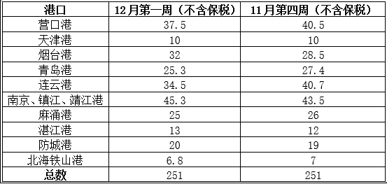 12月第一周,港口氯化钾库存约为251万吨,较上周下调4万吨,同比减少约19万吨。