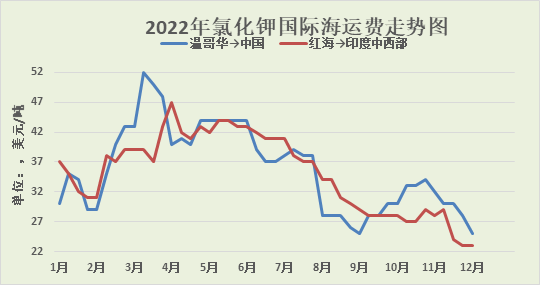 2022年12月第一周,温哥华到中国海运费25美元/吨左右,较上周下调3美元/吨;红海到印度中西部海运费23美元/吨左右,与上周持平。走势图如下:
