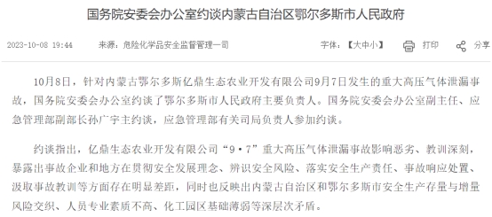 约谈指出,亿鼎生态农业开发有限公司“9·7”重大高压气体泄漏事故影响恶劣、教训深刻,暴露出事故企业和地方在贯彻安全发展理念、辨识安全风险、落实安全生产责任、事故响应处置、汲取事故教训等方面存在明显差距,同时也反映出内蒙古自治区和鄂尔多斯市安全生产存量与增量风险交织、人员专业素质不高、化工园区基础薄弱等深层次矛盾。
