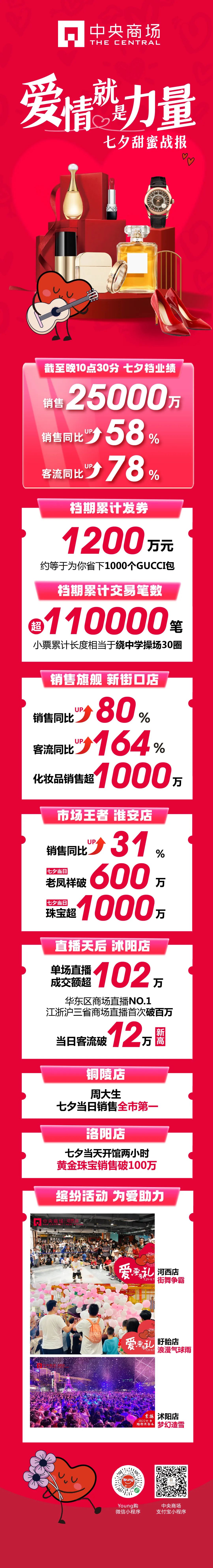 今年七夕对中央商场、合作品牌商及全体消费者来说意义非凡!创新形式的活动及“节礼”概念,成功升华了14座城市的“爱情经济”主题,网罗全城消费活力,线上线下助力全品类销售大幅增长、一举创下多项新高,打出一场足以影响全年的“士气之战”!